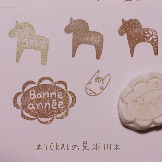 こちらはクラフトパークTOKAIの12月いっぱいまでの消しゴムはんこ教室での見本用に作成しました。
