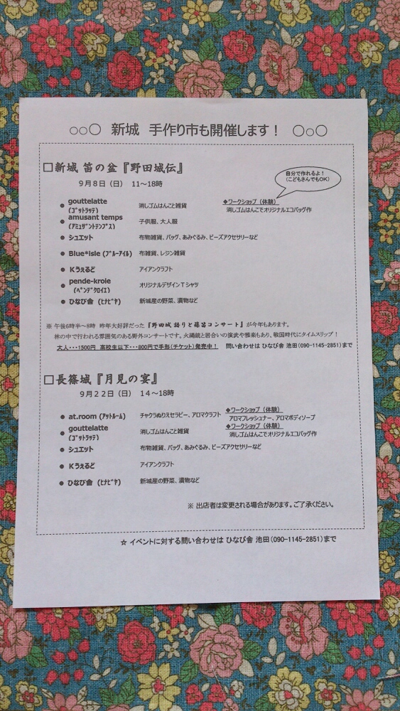 前回の野田城のイベントより、手作り市のメンバーは少な目ですが、みんなきっと委託になってるだろうから、きっと品数は変わらないと思いますよー!!