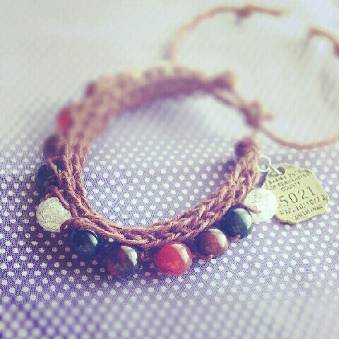 クラック水晶、カーネリアン、レッドタイガーアイ、オブシディアンを編みこんであります。