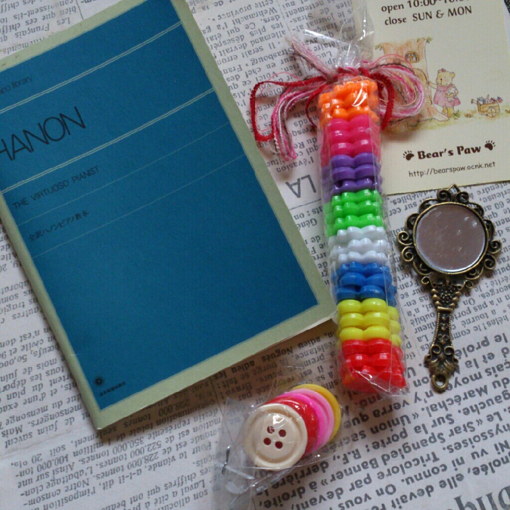ピアノ習ってた方には懐かしのハノンの教則本のメモ帳に、鮮やかな色のおはじき、ボタン。