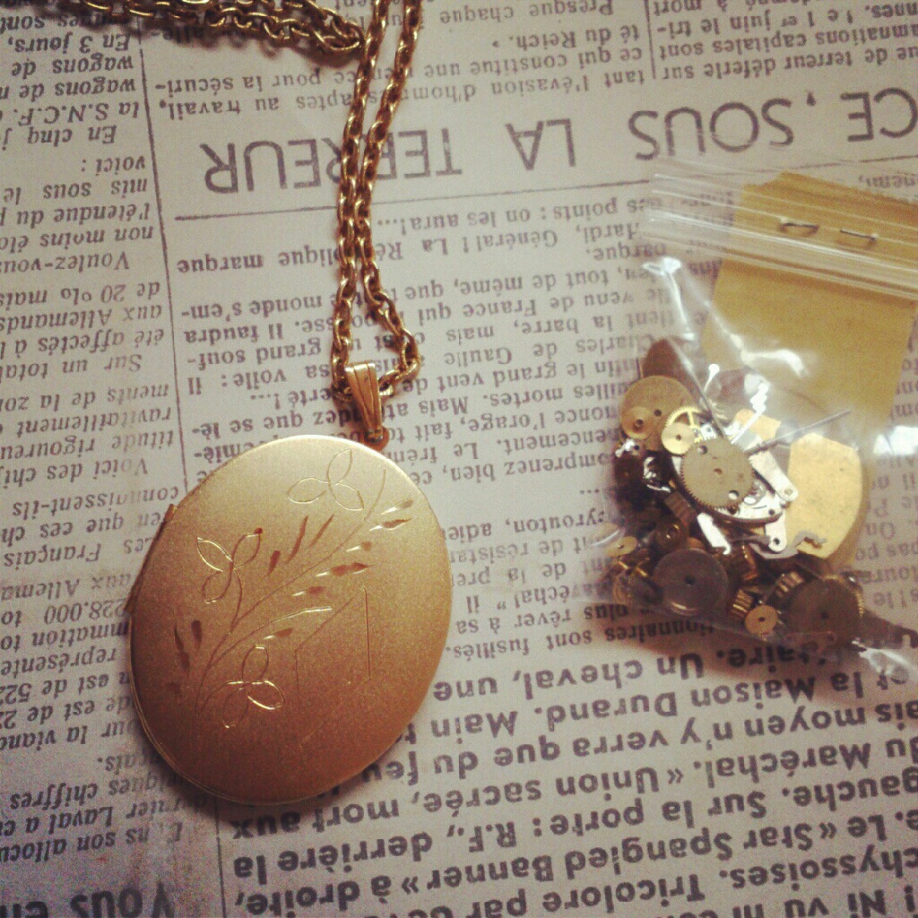 アンティークなロケットペンダントと懐中時計のパーツ。